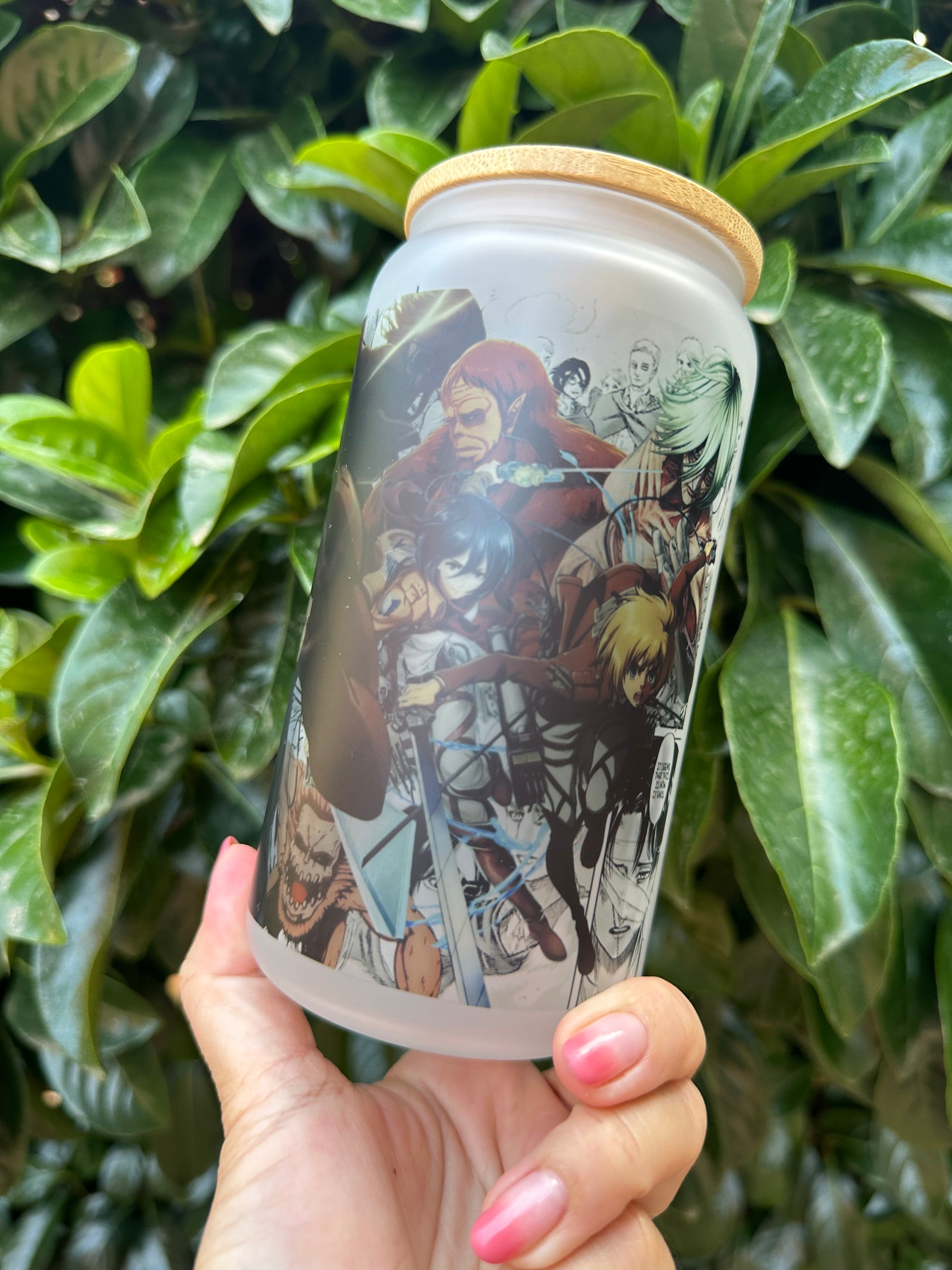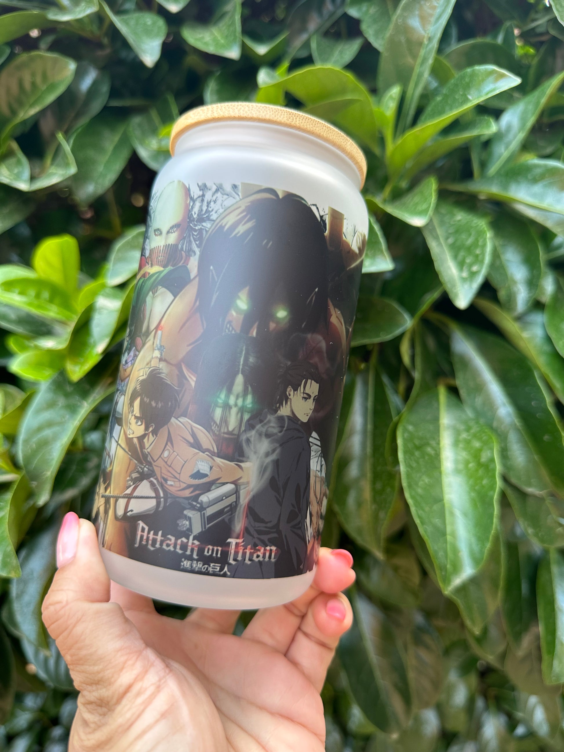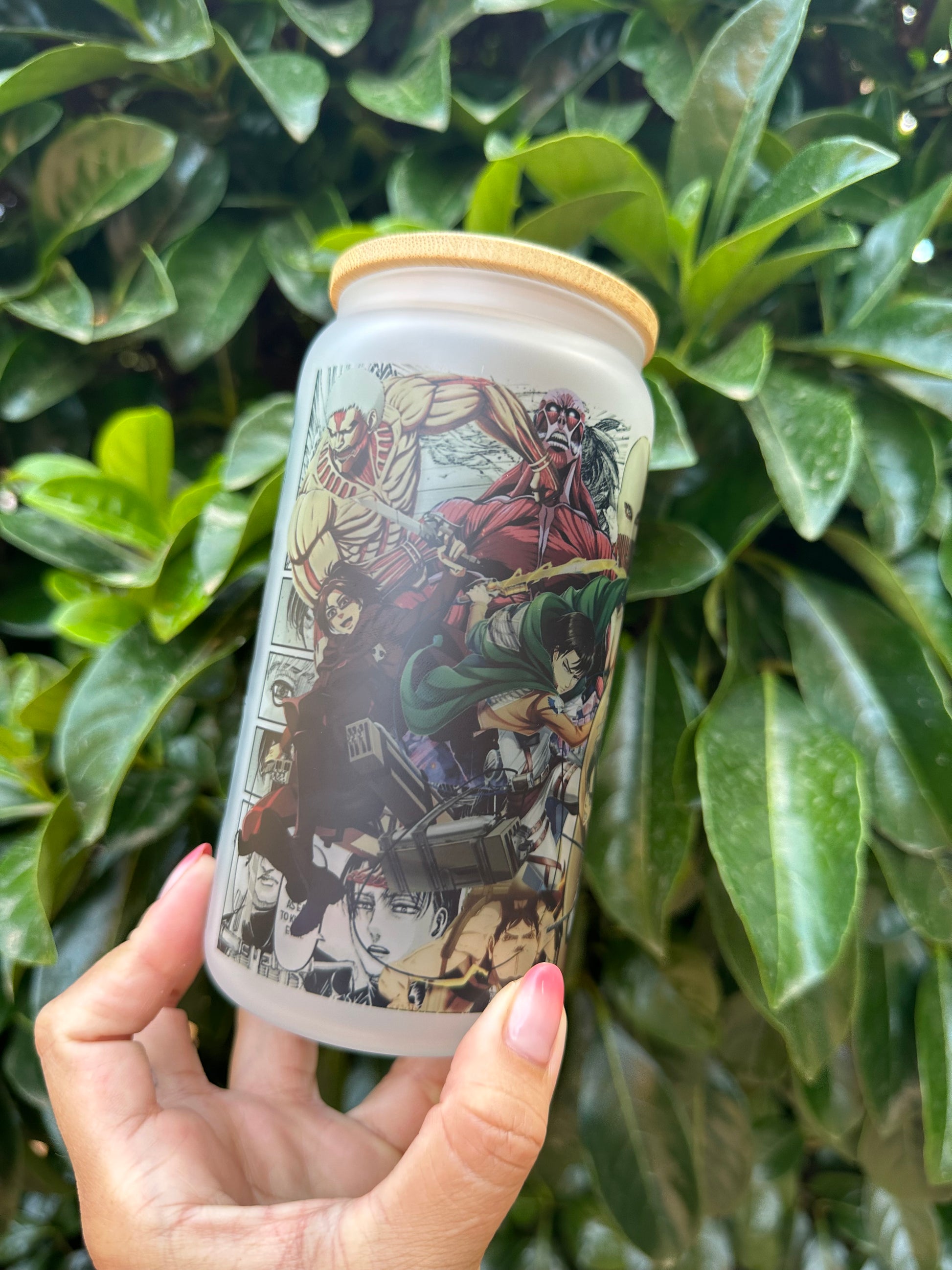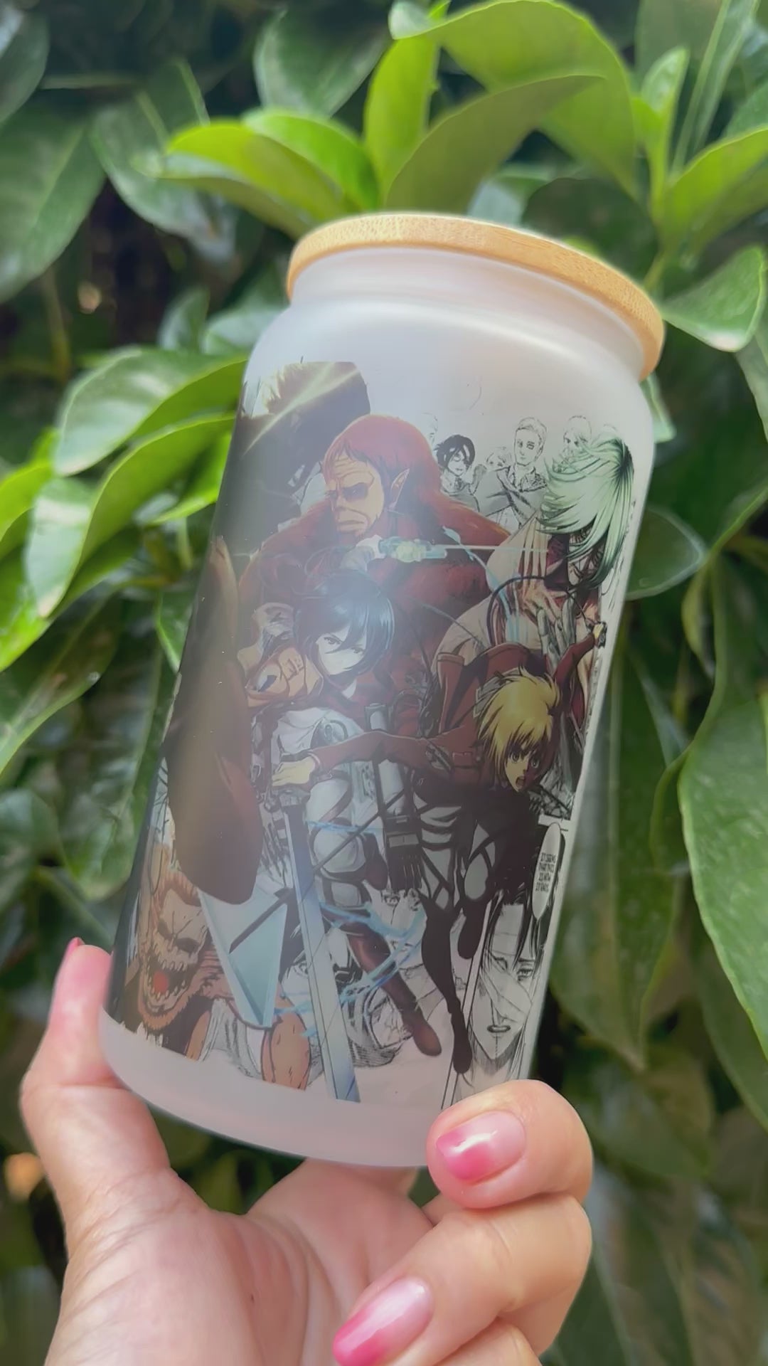 Vaso de cristal. Viene con tapa de bambú y pajita de plástico.
